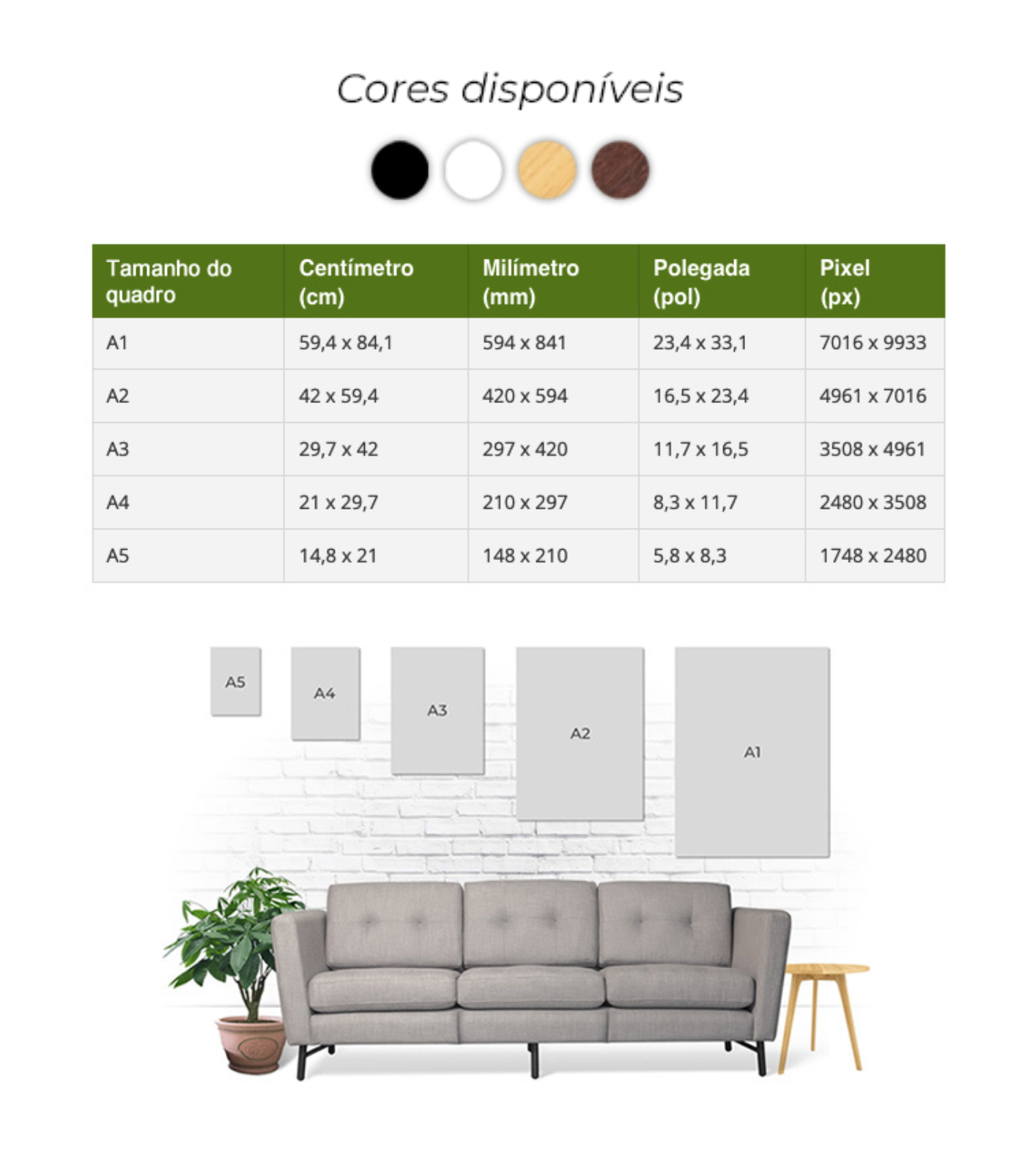 Produzidas em madeira Pinus ou Eucalipto proveniente 100% de reflorestamento, com revestimento em filme PET reciclado, a nossa moldura tradicional é resistente e totalmente à prova de umidade e outras pragas. Nesta opção você recebe seu quadro pronto para pendurar na parede. A moldura tradicional possui 2cm de frente x 1cm de profundidade, já a moldura filete possui 3mm de frente por 3cm de profundidade.